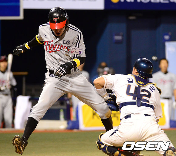 19일 오후 창원 마산야구장에서 열린 2013 한국야쿠르트 세븐프로야구 NC 다이노스와 LG 트윈스의 경기, 5회초 2사 2,3루에서 LG 현재윤의 번트 때 홈으로 쇄도한 3루주자 정성훈이 NC 포수 김태군에게 태그아웃 처리되고 있다.