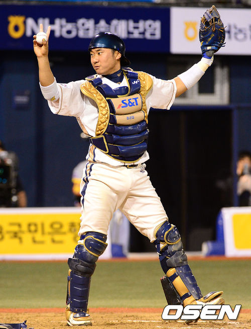 19일 오후 창원 마산야구장에서 열린 2013 한국야쿠르트 세븐프로야구 NC 다이노스와 LG 트윈스의 경기, 5회초 2사 2,3루에서 LG 현재윤의 번트 때 홈으로 쇄도한 3루주자 정성훈을 태그아웃으로 처리한 NC 김태군이 동료들을 향해 사인을 보내고 있다.