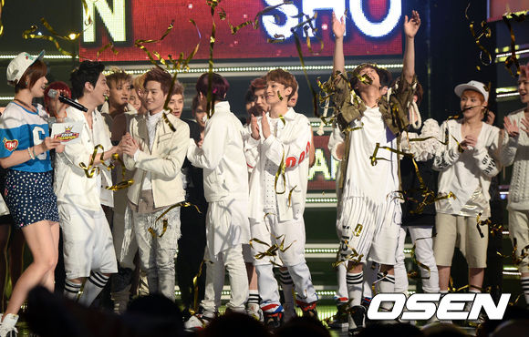 19일 오후 서울 유니클로 악스홀에서 진행된 MBC MUSIC '쇼 챔피언'에서 1위를 차지한 EXO가 기뻐하고 있다.