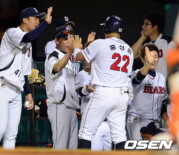 19일 오후 서울 잠실구장에서 열린 '2013 한국야쿠르트 세븐 프로야구' 두산 베어스와 롯데 자이언츠의 경기 5회말 2사 2,3루 대타 오재일의 2타점 2루타에 홈을 밟은 홍성흔이 덕아웃에서 동료들과 하이파이브를 하고 있다.