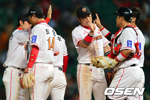 승리를 거둔 SK 선수들이 마운드에서 하이파이브를 나누고 있다. /dreamer@osen.co.kr