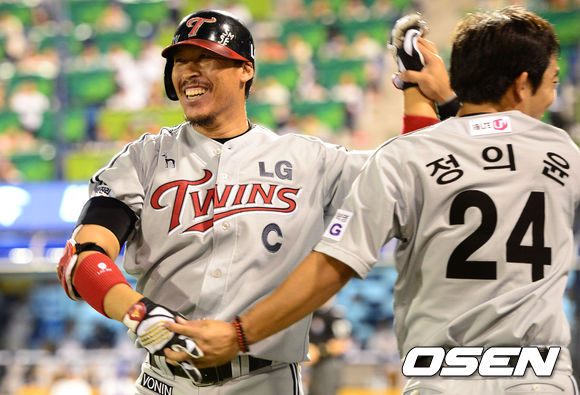 19일 오후 창원 마산야구장에서 열린 2013 한국야쿠르트 세븐프로야구 NC 다이노스와 LG 트윈스의 경기, 8회초 2사 1,2루에서 LG 이병규가 우월 스리런 홈런을 치고 덕아웃에서 동료들과 환호하고 있다.