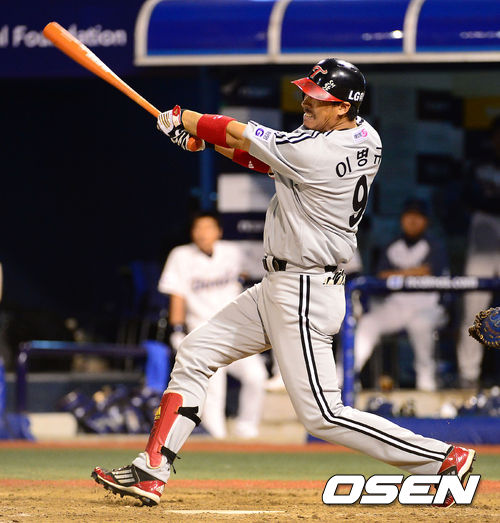19일 오후 창원 마산야구장에서 열린 2013 한국야쿠르트 세븐프로야구 NC 다이노스와 LG 트윈스의 경기, 8회초 2사 1,2루에서 LG 이병규가 우월 스리런 홈런을 치고 있다.