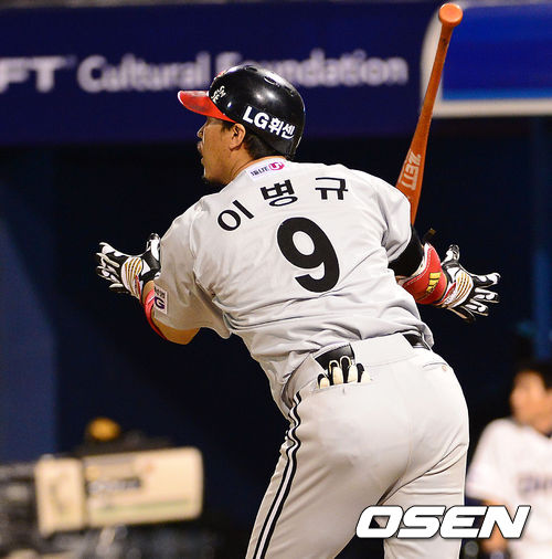 19일 오후 창원 마산야구장에서 열린 2013 한국야쿠르트 세븐프로야구 NC 다이노스와 LG 트윈스의 경기, 8회초 2사 1,2루에서 LG 이병규가 우월 스리런 홈런을 치고 있다.