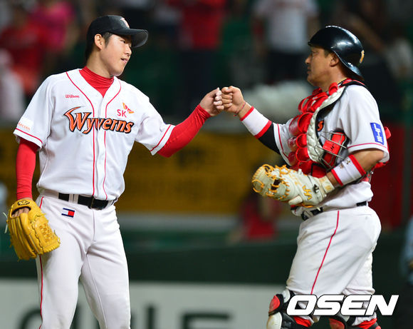 9회초 삼성 공격 2사 1, 3루 상황 이지영을 삼진으로 잡아내며 경기를 마무리지은 SK 투수 박희수와 포수 조인성이 인사를 나누고 있다./dreamer@osen.co.kr