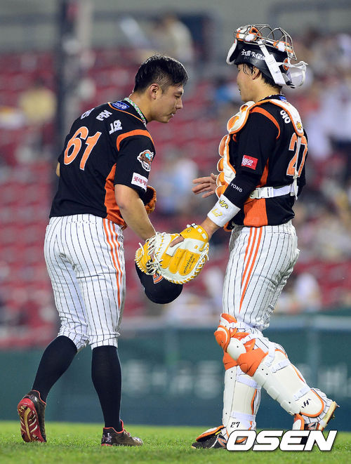 19일 오후 서울 잠실구장에서 열린 '2013 한국야쿠르트 세븐 프로야구' 두산 베어스와 롯데 자이언츠의 경기 종료 후 허준혁과 용덕한이 인사를 나누고 있다.