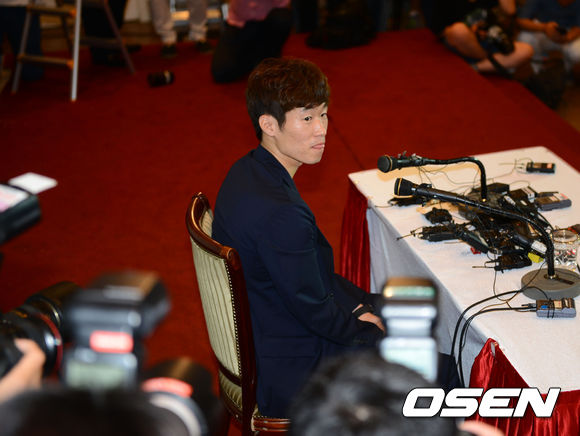 20일 오전 수원월드컵경기장 컨벤션 웨딩홀에서 열린 박지성 기자회견 및 JS파운데이션 재능학생 후원금 전달식에서 박지성이 질문에 답하며 입술을 적시고 있다.