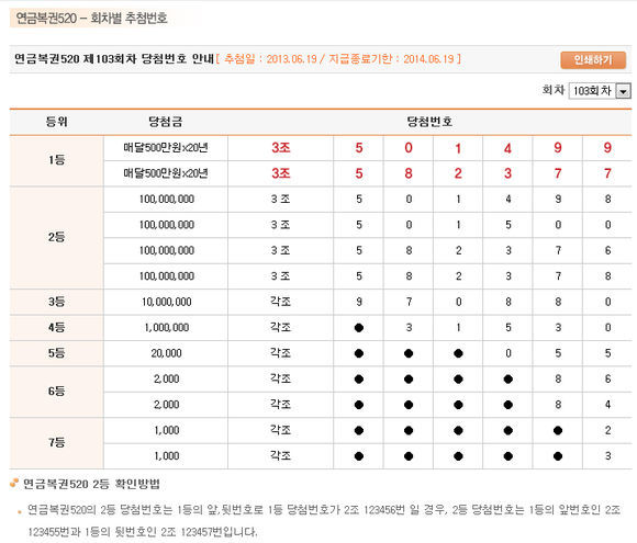[OSEN=이슈팀] 20년 동안 매월 500만 원씩 받게 되는 연금복권520 제 103회차 1등 당첨번호가 발표됐다.