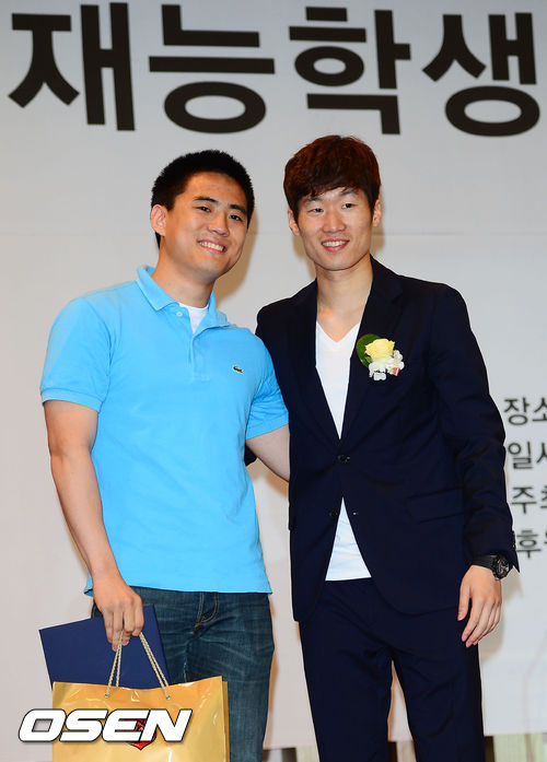 20일 오전 수원월드컵경기장 컨벤션 웨딩홀에서 열린 박지성 기자회견 및 JS파운데이션 재능학생 후원금 전달식에서 박지성이 후원금을 전달한 후 포토타임을 갖고 있다.