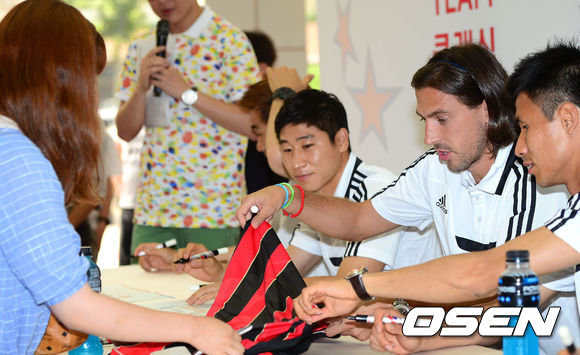 20일 오전 서울 중구 을지로 하나은행 본점에서 진행된 K리그 올스타전 팬사인회에서 정조국과 데얀이 여성팬이 가지고온 FC서울 유니폼에 사인을 하고 있다.
