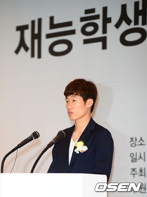 20일 오전 수원월드컵경기장 컨벤션 웨딩홀에서 열린 박지성 기자회견 및 JS파운데이션 재능학생 후원금 전달식에서 박지성이 단상에서 축사를 하고 있다.