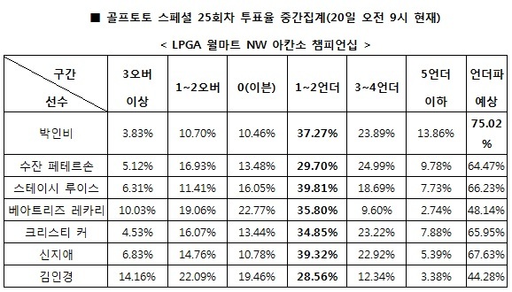 국민체육진흥공단(www.kspo.or.kr)이 발행하는 체육진흥투표권 수탁사업자인 스포츠토토 공식 온라인 발매 사이트인 베트맨(www.betman.co.kr)은 오는 21일 미국 아칸소에서 열리는 미국여자프로골프(LPGA)투어 '월마트 NW 아칸소 챔피언십' 1라운드를 대상으로 한 골프토토 스페셜 25회차에서 전체 참가자의 75.02%가 박인비의 언더파 활약을 예상했다고 밝혔다.