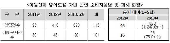 한국소비자원(www.kca.go.kr)에 따르면 1372소비자상담센터에 접수된 '이동전화 명의도용 가입' 관련 상담 및 피해구제 건수는 매년 큰 폭으로 증가하고 있다. 특히 상담은 2011년 93건에서 2012년 418건으로 4.5배 증가했고, 2013년 1월부터 5월까지는 전년 동기 대비 13.5배나 증가했다.