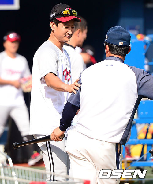 20일 오후 창원 마산야구장에서 열린 2013 한국야쿠르트 세븐프로야구 NC 다이노스와 LG 트윈스의 경기, 경기에 앞서 LG 박용택이 NC 김광림 코치와 이야기를 나누고 있다.