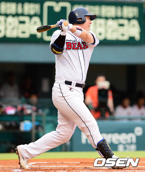 19일 오후 서울 잠실구장에서 열린 '2013 한국야쿠르트 세븐 프로야구' 두산 베어스와 롯데 자이언츠의 경기 1회말 1사 2루 김현수가 1타점 적시타를 치고 있다.