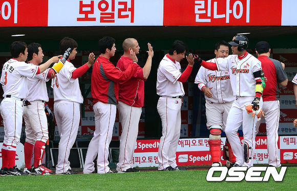 20일 오후 인천 문학구장에서 열린 '2013 한국야쿠르트 세븐 프로야구' SK 와이번스와 삼성 라이온즈의 경기, 2회말 무사 SK 김상현이 솔로홈런을 때린 뒤 동료들과 기뻐하고 있다.