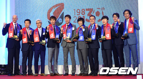 레전드 베스트 11에 선정된 신의손, 최강희, 박경훈, 김태영, 유상철, 서정원, 김주성, 신태용, 황선홍, 최순호 선수가 인증패를 받고 포토타임을 하고 있다.