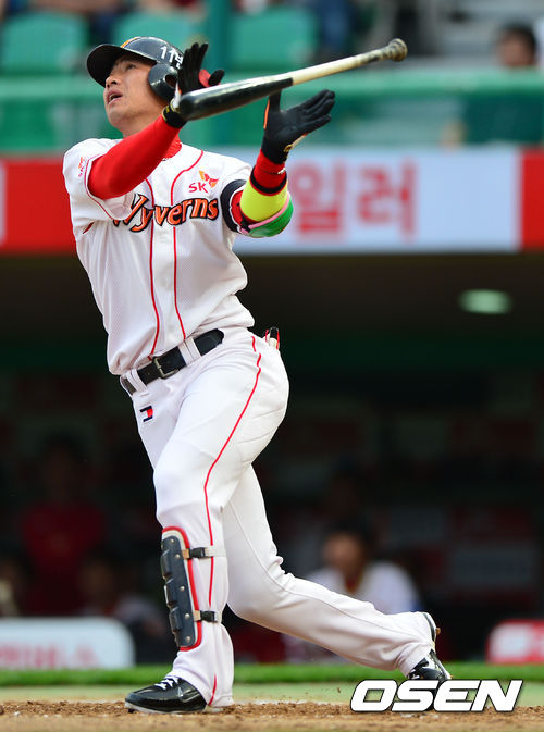 20일 오후 인천 문학구장에서 '2013 한국야쿠르트 세븐 프로야구' SK 와이번스 대 삼성 라이온즈의 경기가 열렸다. 2회말 선두타자로 나선 4번 김상현이 좌월 선제 솔로포를 날리고 있다.