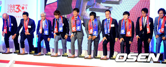 레전드 베스트 11에 선정된 신의손, 최강희, 박경훈, 김태영, 유상철, 서정원, 김주성, 신태용, 황선홍, 최순호 선수가 풋프린팅을 하며 포토타임을 하고 있다.