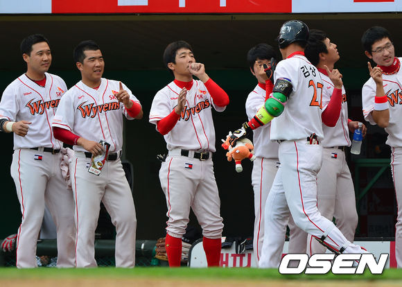 20일 오후 인천 문학구장에서 '2013 한국야쿠르트 세븐 프로야구' SK 와이번스 대 삼성 라이온즈의 경기가 열렸다. 2회말 선두타자로 나선 4번 김상현이 좌월 선제 솔로포를 날리고 조동화를 비롯한 더그아웃 동료들과 인사를 나누고 있다.