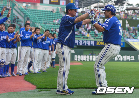 3회초 1사 1, 3루 상황 이승엽이 좌월 3점포를 날리고 류중일 감독과 포옹을 나누고 있다./dreamer@osen.co.kr