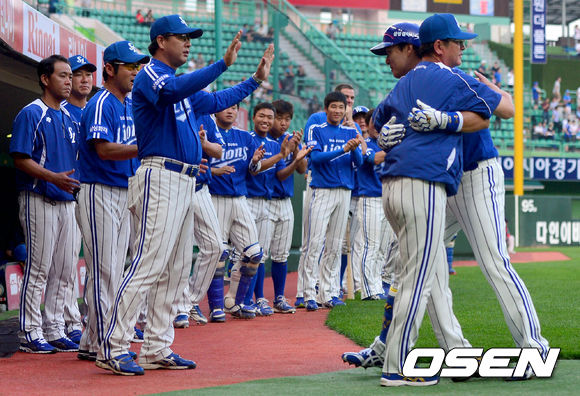 3회초 1사 1, 3루 상황 이승엽이 좌월 3점포를 날리고 류중일 감독을 비롯한 코칭스태프, 동료들의 축하를 받고 있다./dreamer@osen.co.kr