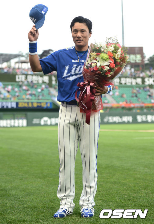 3회초 삼성 공격 종료 후 이승엽이 삼성 김인 사장에게 꽃다발을 전달받은 뒤 기념촬영을 하고 있다./dreamer@osen.co.kr