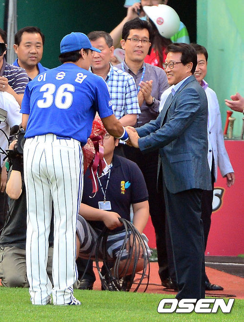 20일 오후 인천 문학구장에서 열린 '2013 한국야쿠르트 세븐 프로야구' SK 와이번스와 삼성 라이온즈의 경기, 삼성 라이온스 김인 사장이 3회초 통산 352호 홈런 대기록을 작성한 이승엽을 축하해주고 있다.