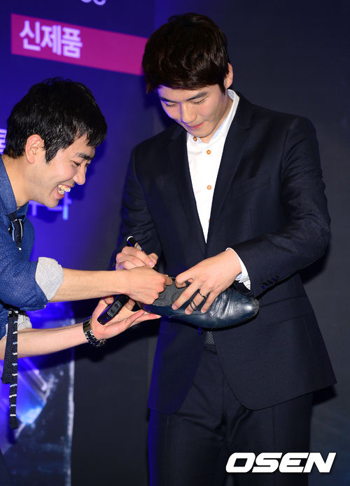 20일 오후 서울 영등포 타임스퀘어 아트리움에서 진행된 면도기 브랜드 브라운 신제품 쿨텍 출시 론칭행사에서 축구선수 기성용이 리포터의 신발에 사인을 하고 있다
