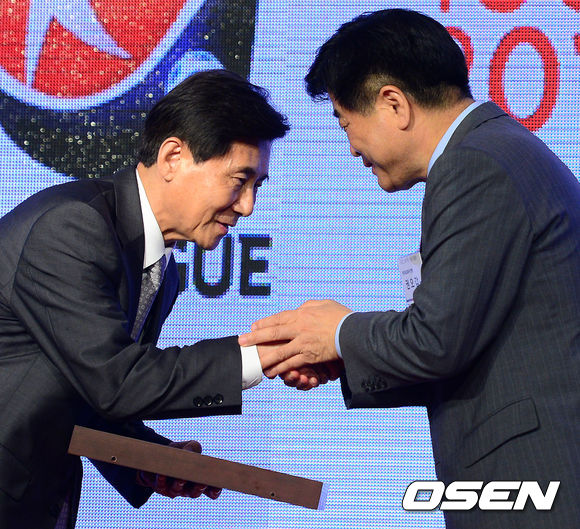 한국프로축구연맹 김정남 부총재가 한국프로축구연맹 권오갑 총재에게 공로패를 받고 있다.