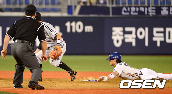 20일 오후 창원 마산야구장에서 열린 2013 한국야쿠르트 세븐프로야구 NC 다이노스와 LG 트윈스의 경기, 5회말 무사 1루에서 NC 박정준 타석 때 1루주자 김종호가 도루에 성공하고 있다.