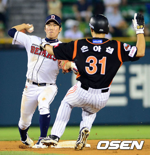 19일 오후 서울 잠실구장에서 열린 '2013 한국야쿠르트 세븐 프로야구' 두산 베어스와 롯데 자이언츠의 경기 6회초 무사 1루 강민호의 병살타를 허경민이 2루에서 포스아웃 시킨 후 1루로 송구하고 있다.
