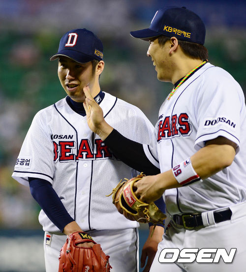 19일 오후 서울 잠실구장에서 열린 '2013 한국야쿠르트 세븐 프로야구' 두산 베어스와 롯데 자이언츠의 경기 7회초까지 무실점 역투를 펼친 유희관이 덕아웃으로 향하며 김현수의 격려를 받고 있다.