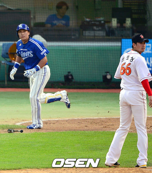 20일 오후 인천 문학구장에서 '2013 한국야쿠르트 세븐 프로야구' SK 와이번스 대 삼성 라이온즈의 경기, 3회초 1사 1,3루 삼성 이승엽과 SK 윤희상이 통산 352호 홈런의 타구를 바라보고 있다.