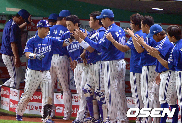 20일 오후 인천 문학구장에서 '2013 한국야쿠르트 세븐 프로야구' SK 와이번스 대 삼성 라이온즈의 경기, 8회초 1사 삼성 김태완이 솔로홈런을 때린 뒤 동료들에게 축하받고 있다.