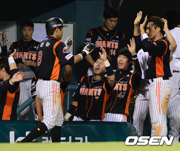 19일 오후 서울 잠실구장에서 열린 '2013 한국야쿠르트 세븐 프로야구' 두산 베어스와 롯데 자이언츠의 경기 8회초 2사 1,3루 정훈의 1타점 적시타에 홈을 밟은 전준우가 덕아웃에서 동료들과 하이파이브를 하고 있다.