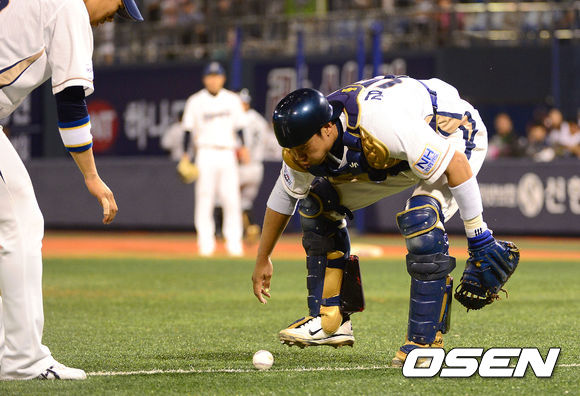 20일 오후 창원 마산야구장에서 열린 2013 한국야쿠르트 세븐프로야구 NC 다이노스와 LG 트윈스의 경기, 8회초 1사에서 LG 이진영의 번트 타구가 라인에서 멈추자 NC 포수 김태군이 입바람을 부록 있다.