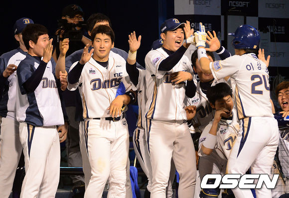 20일 오후 창원 마산야구장에서 열린 2013 한국야쿠르트 세븐프로야구 NC 다이노스와 LG 트윈스의 경기, 8회말 1사 3루에서 NC 권희동의 좌전 적시타 때 홈을 밟은 3루주자 이상호가 덕아웃에서 동료들의 축하를 받고 있다.