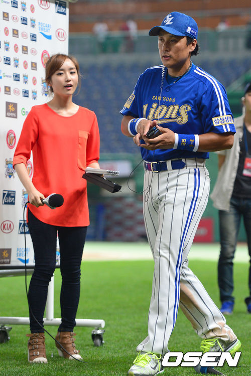 금실이 박힌 통산 352호 홈런포 기념 유니폼을 입은 이승엽이 방송 인터뷰를 갖기 위해 발걸음을 옮기고 있다. /dreamer@osen.co.kr