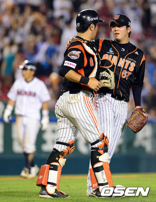 19일 오후 서울 잠실구장에서 열린 '2013 한국야쿠르트 세븐 프로야구' 두산 베어스와 롯데 자이언츠의 경기 종료 후 김성배와 강민호가 하이파이브를 하고 있다.