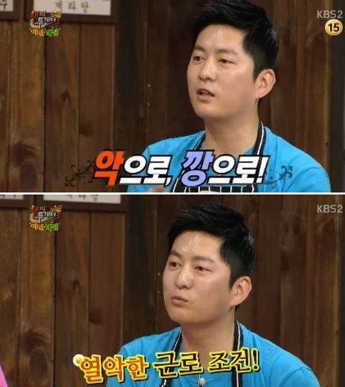 강레오는 20일 방송된 KBS 2TV 예능 프로그램 '해피투게더3'에 출연해 "외국이라고 하면 복지가 좋은 환경에서 일할 줄 알았는데 사실 주방에는 근로기준법이 없다. 18~20시간을 일하는데 악으로 깡으로 버텼다"고 밝혔다.