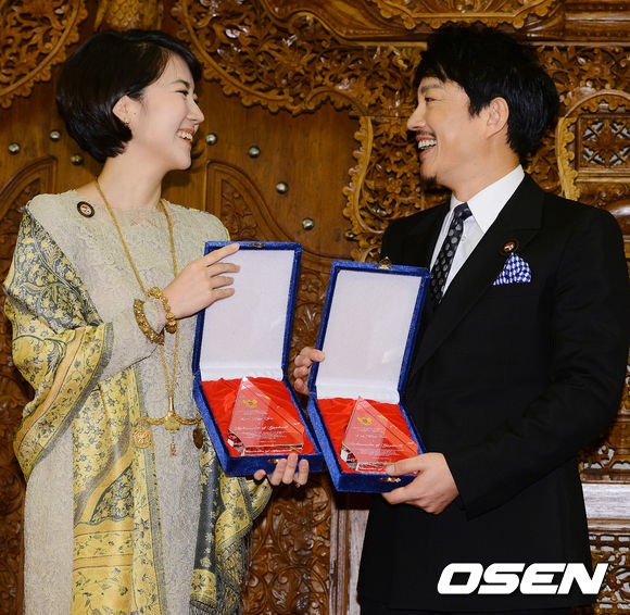 이범수 이윤진 부부가 위촉패를 들고 포토타임을 갖고 있다.