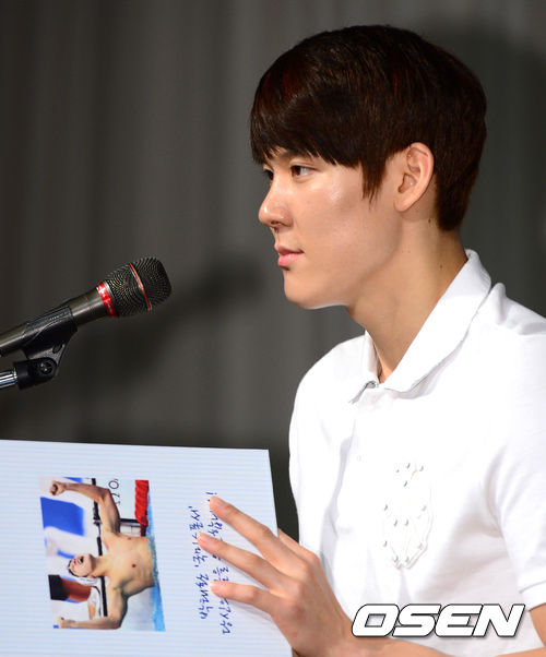 박태환이 질문에 귀기울이고 있다.