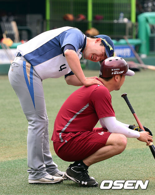 21일 오후 목동구장에서 열리는 '2013 한국야쿠르트 세븐 프로야구' 넥센 히어로즈와 NC 다이노스의 경기전 NC 지석훈이 배팅연습을 기다리는 넥센 이택근과 이야기를 나누고 있다.