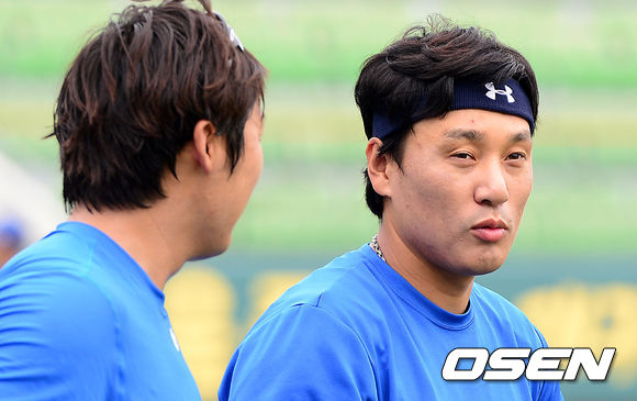 21일 오후 대구시민운동장 야구장에서 열린 2013 한국야쿠르트 세븐프로야구 삼성 라이온즈와 LG 트윈스의 경기, 경기에 앞서 삼성 이승엽이 훈련 중 배영수와 이야기를 나누고 있다.