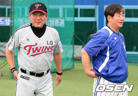 21일 오후 대구시민운동장 야구장에서 열린 2013 한국야쿠르트 세븐프로야구 삼성 라이온즈와 LG 트윈스의 경기, 경기에 앞서 LG 김기태 감독과 삼성 류중일 감독이 덕아웃으로 이동하고 있다.