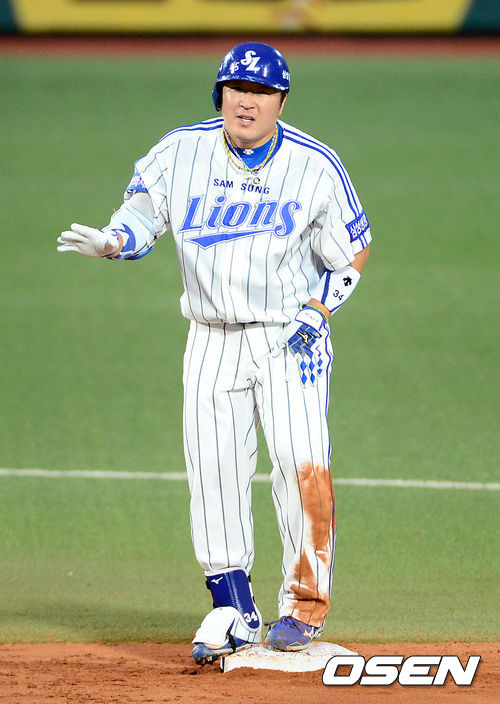 21일 오후 대구시민운동장 야구장에서 열린 2013 한국야쿠르트 세븐프로야구 삼성 라이온즈와 LG 트윈스의 경기, 4회말 1사 2루에서 삼성 최형우가 우전 적시타를 치고 2루에서 타임을 요청하고 있다.