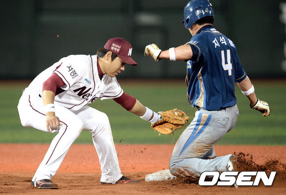 21일 오후 목동구장에서 열린 '2013 한국야쿠르트 세븐 프로야구' 넥센 히어로즈와 NC 다이노스의 경기, 6회초 2사 1루 NC 지석훈이 2루 도루를 시도하다 2루에서 태그아웃 당하고 있다.