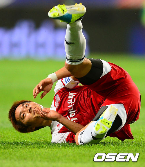 후반 클래식팀 김남일이 반칙을 얻으며 넘어지고 있다.