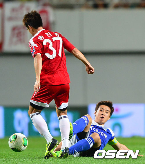 후반 챌린지팀 구자철이 클래식팀 송진영의 공을 뺏기 위해 태클을 시도하고 있다.